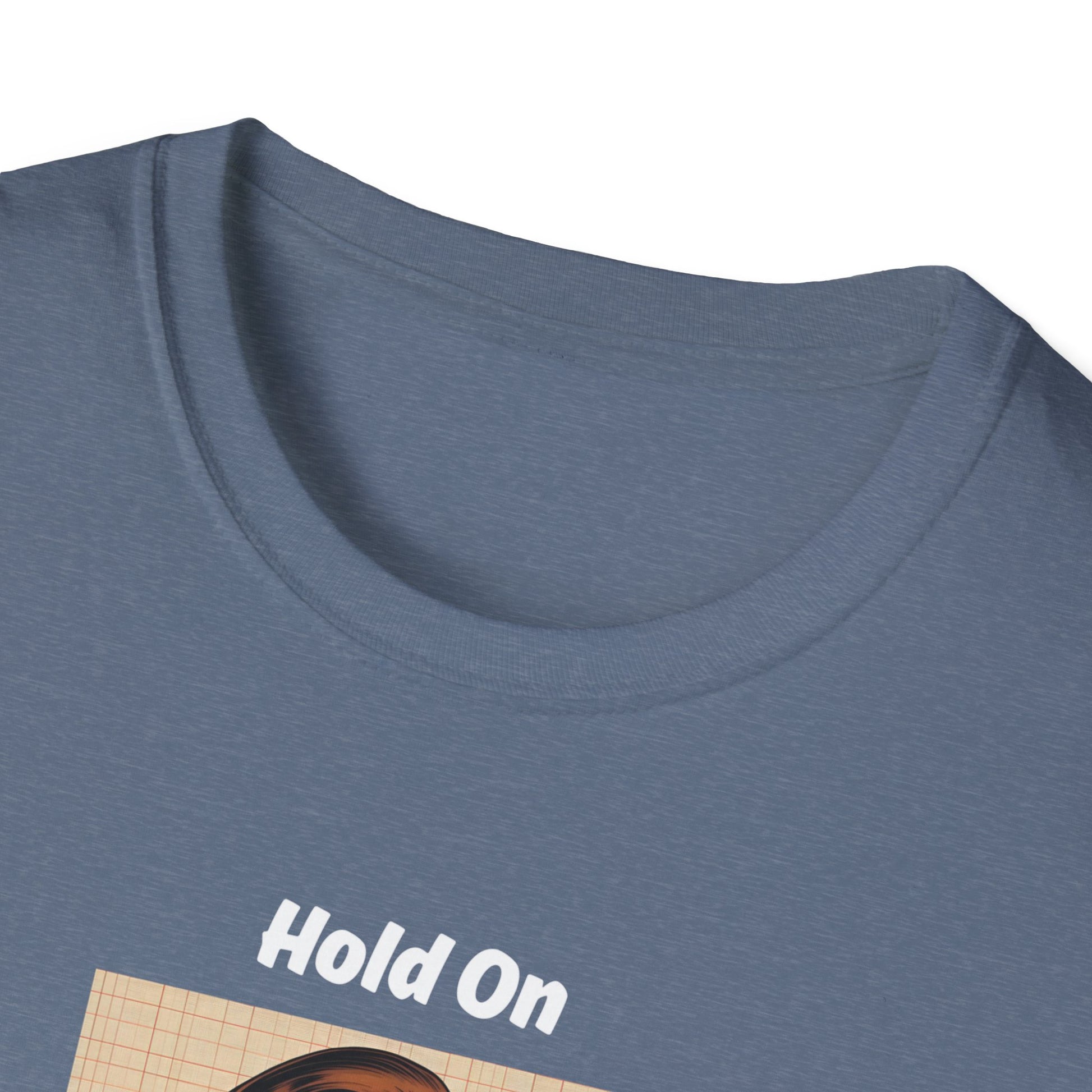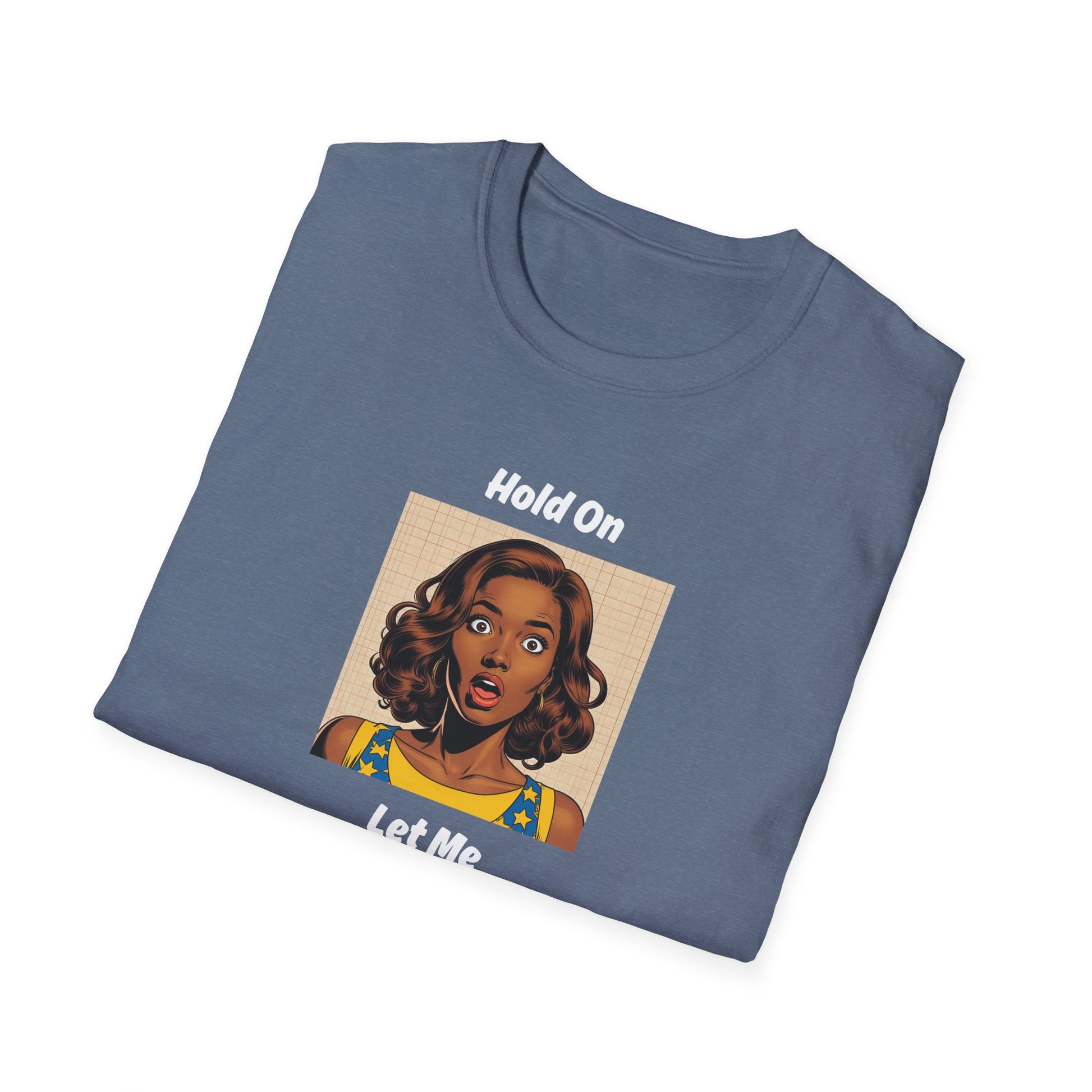 “Hold on, let me overthink this” features a retro-inspired woman frozen in wide-eyed surprise — a comic-book style wink at our daily mental spirals.