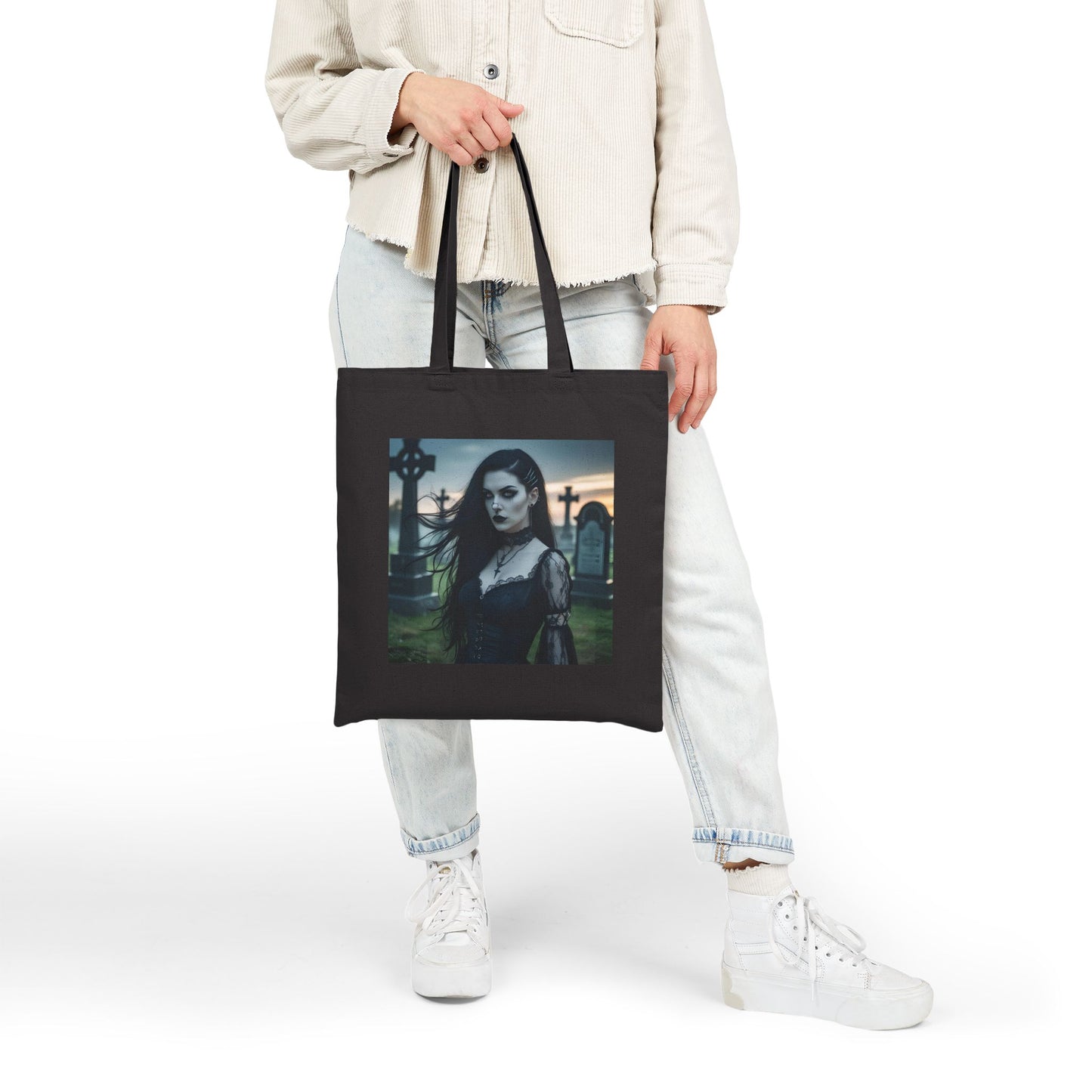 Carry a touch of mystery with this striking gothic canvas tote. Featuring a hauntingly beautiful woman standing among weathered gravestones, the design radiates elegance and shadowed allure. Perfect for lovers of gothic fashion, dark aesthetics, or anyone who enjoys unique statement accessories. Durable, artistic, and unforgettable.