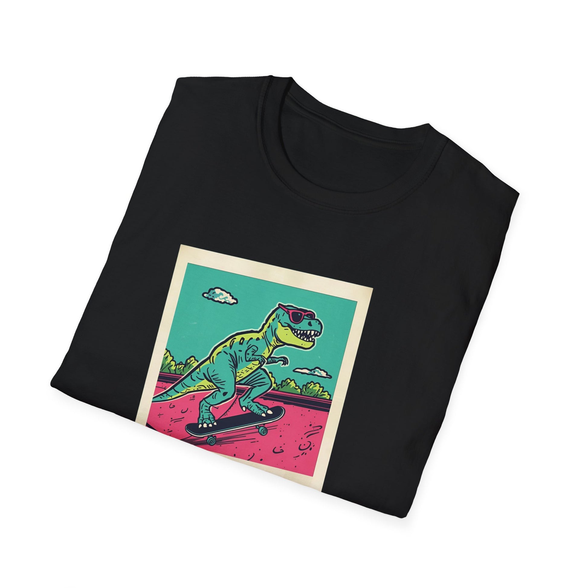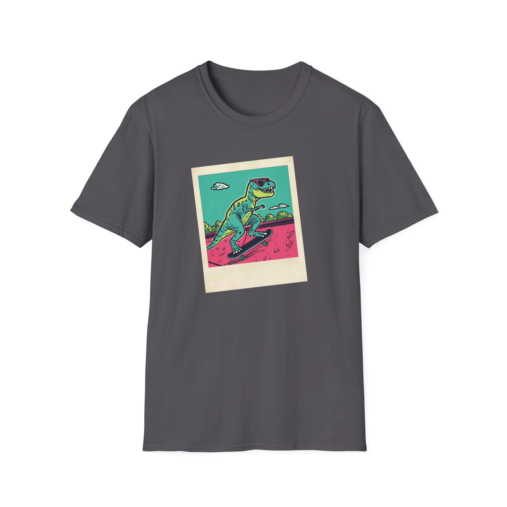 Bring back the ultimate 90s nostalgia with this retro skater T-Rex tee! Featuring a polaroid-style snapshot of a T-Rex in cool sunglasses shredding a halfpipe, this design oozes neon skater vibes with a grunge twist. I