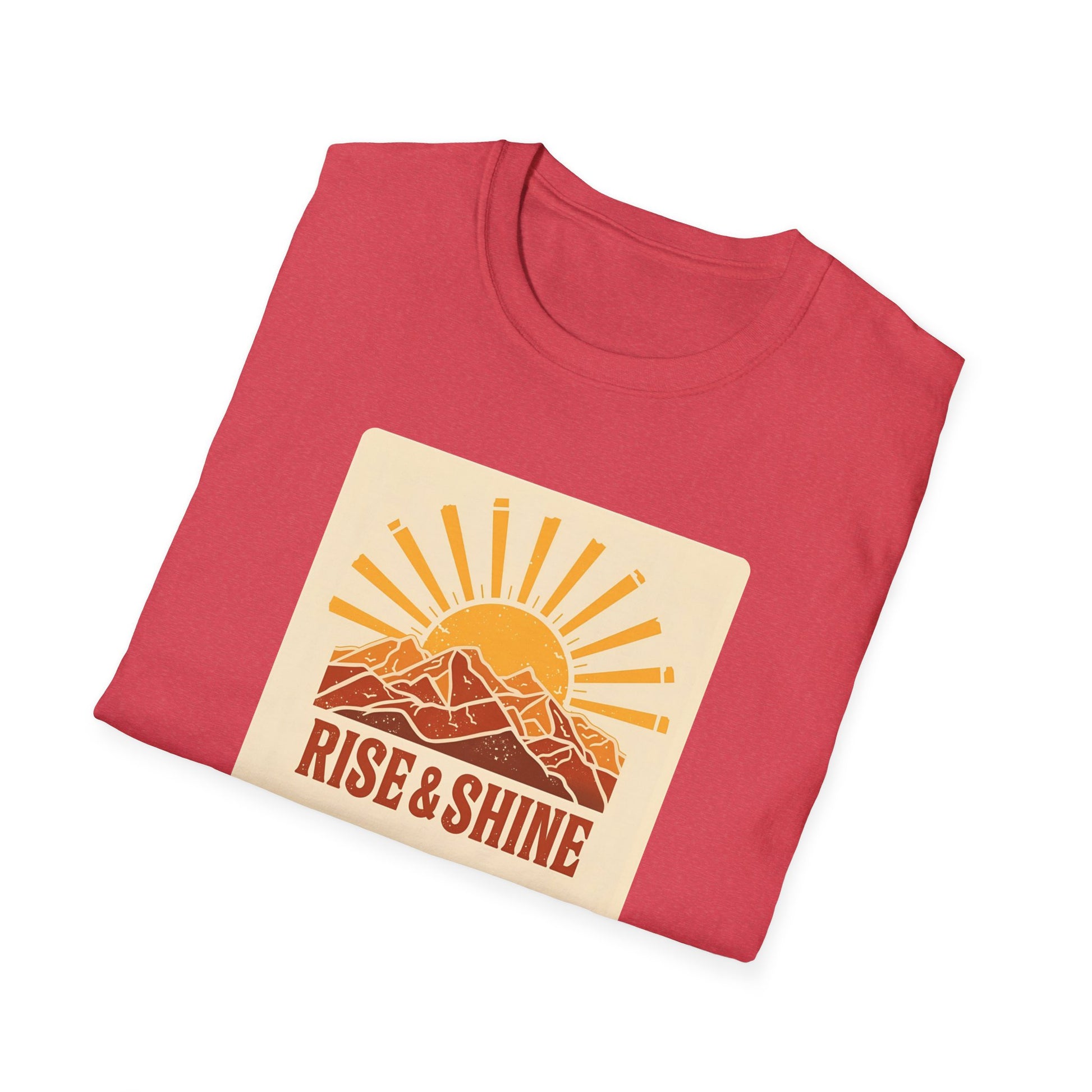 Start the day bold with this “Rise & Shine” retro tee. Featuring a rising sun with golden rays stretching over stylized mountains in a warm 70s-inspired palette, it captures an energetic and optimistic vibe. Perfect for vintage lovers, free spirits, and anyone who thrives on positivity and style.